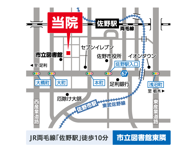 電車の場合 両毛線(東武佐野線)佐野駅を出て、西方面へ徒歩約15分。